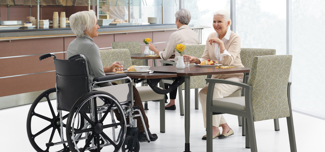 Healthcare dining areas are designed to support comfort, accessibility, and dignity for patients and residents. Layouts consider mobility needs, wheelchair access, and ease of movement, while tables and seating are selected for stability, proper support, and safe daily use.